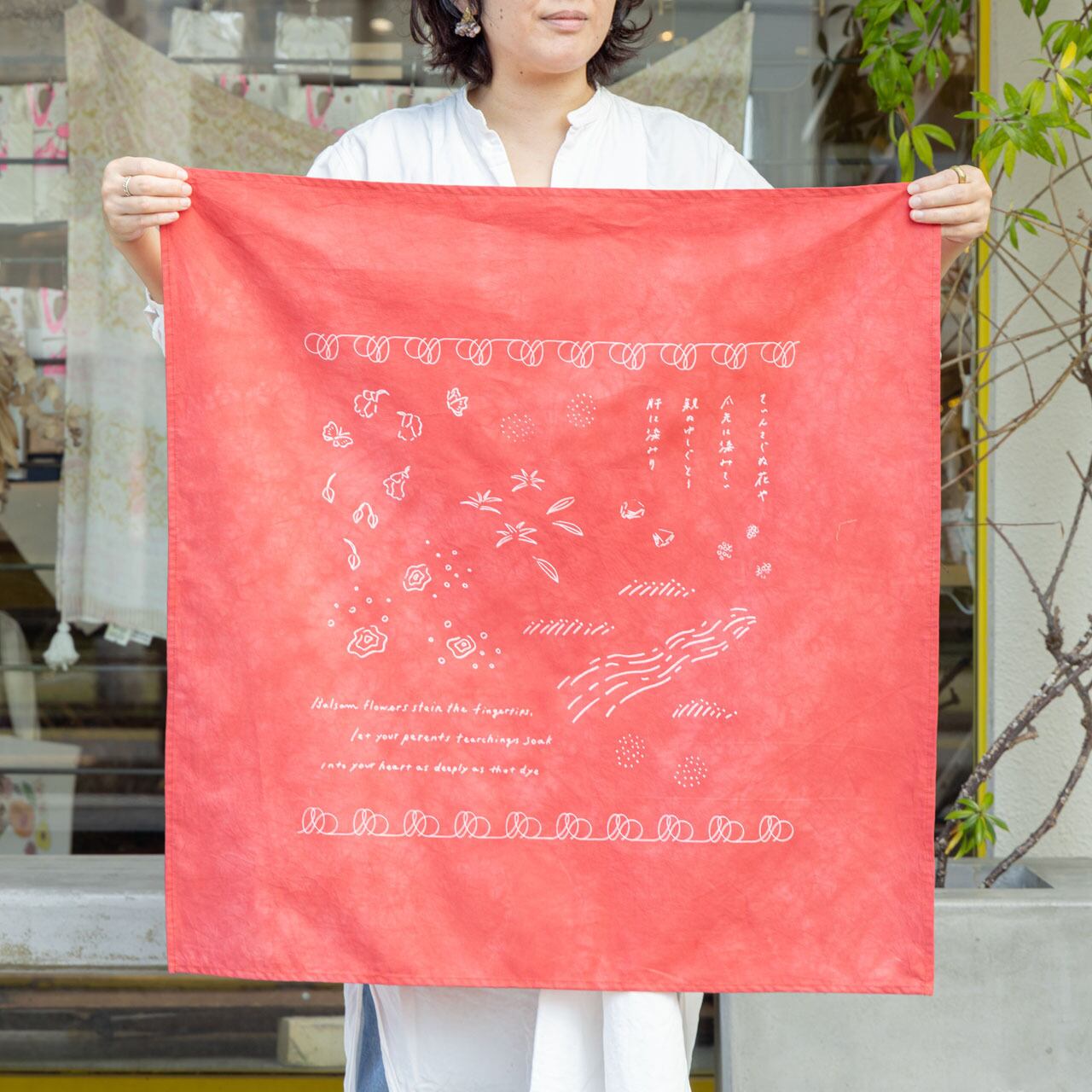 沖縄に育つ草花から抽出した染料で1枚ずつ草木染めを施した生地に、沖縄の民謡「てぃんさぐぬ花」の歌詞を重ねてプリントしたスカーフ。大判なのでファッションのアクセントになるだけでなく、時にはさっと荷物を包むのにも便利です。