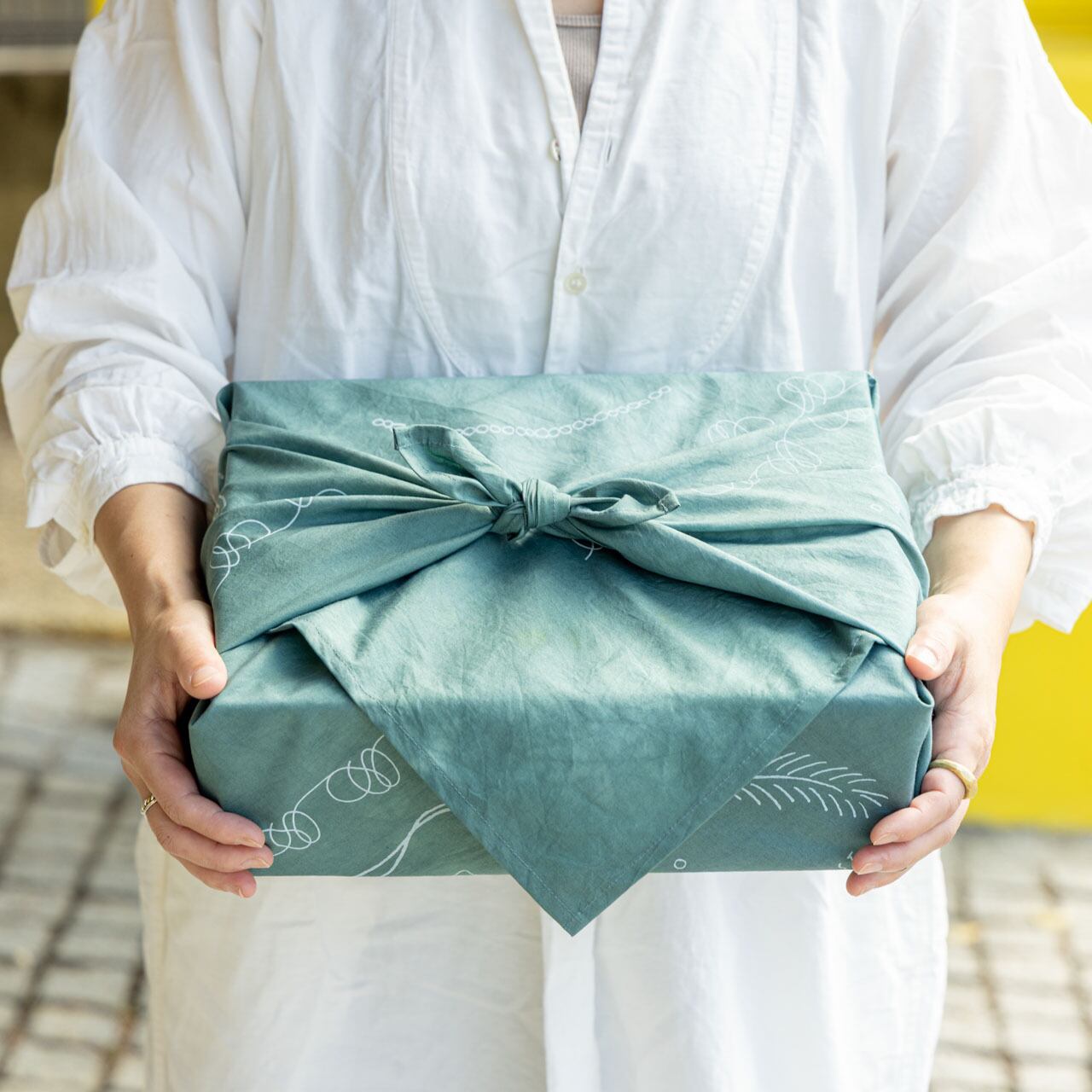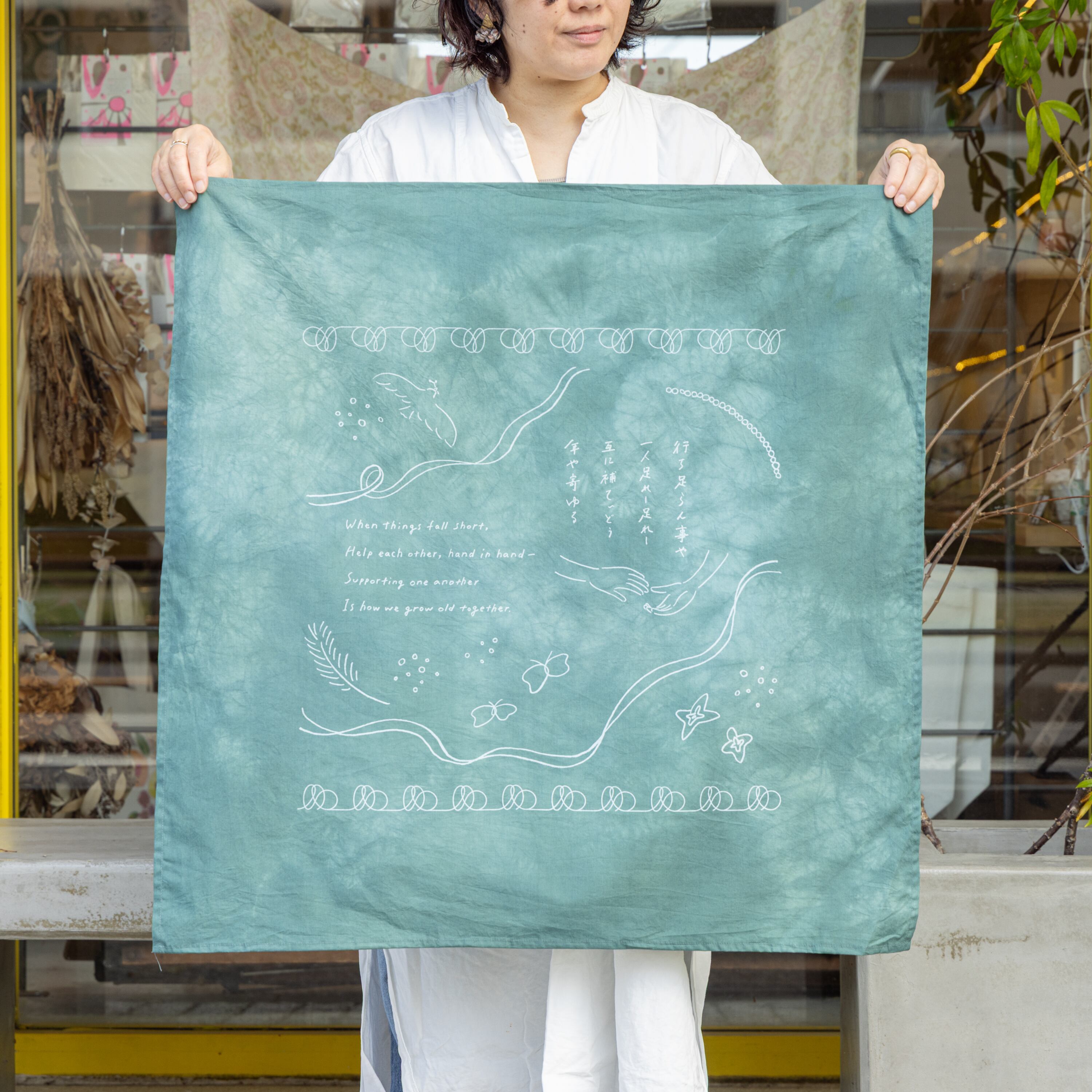 沖縄に育つ草花から抽出した染料で1枚ずつ草木染めを施した生地に、沖縄の民謡「てぃんさぐぬ花」の歌詞を重ねてプリントしたスカーフ。大判なのでファッションのアクセントになるだけでなく、時にはさっと荷物を包むのにも便利です。