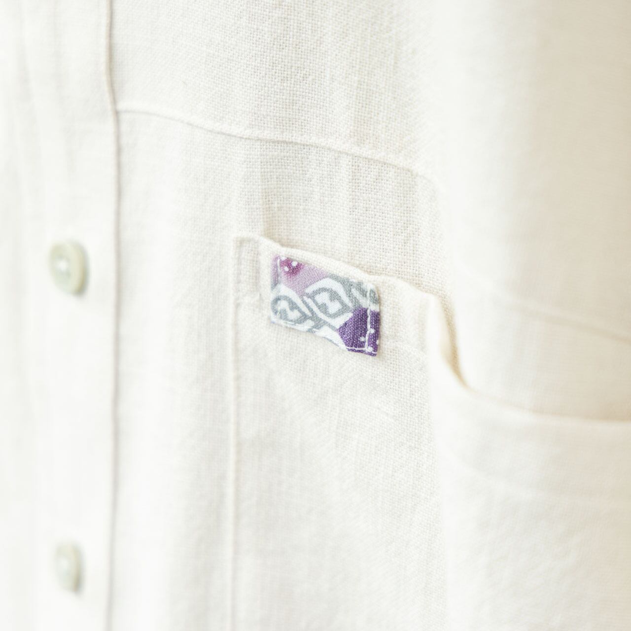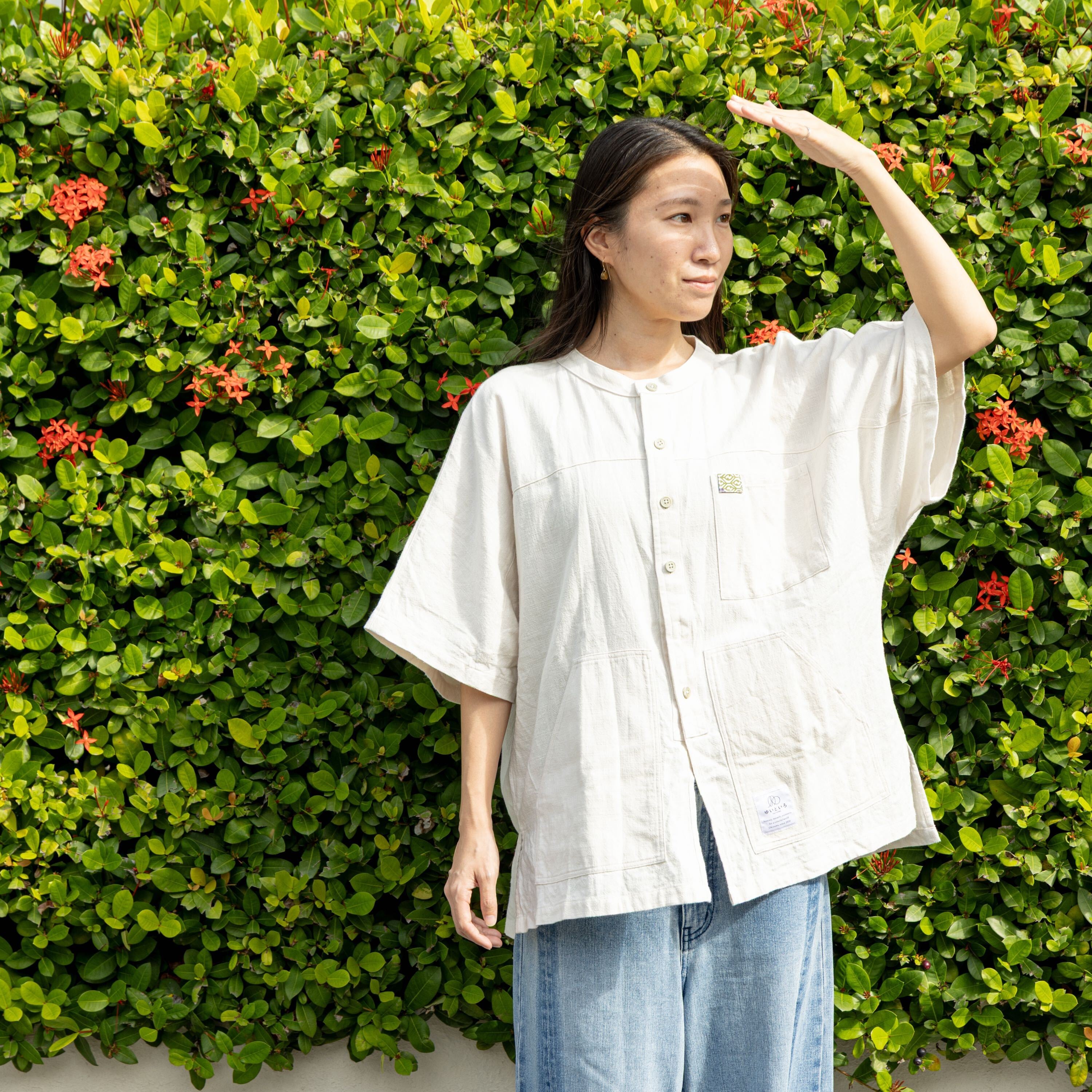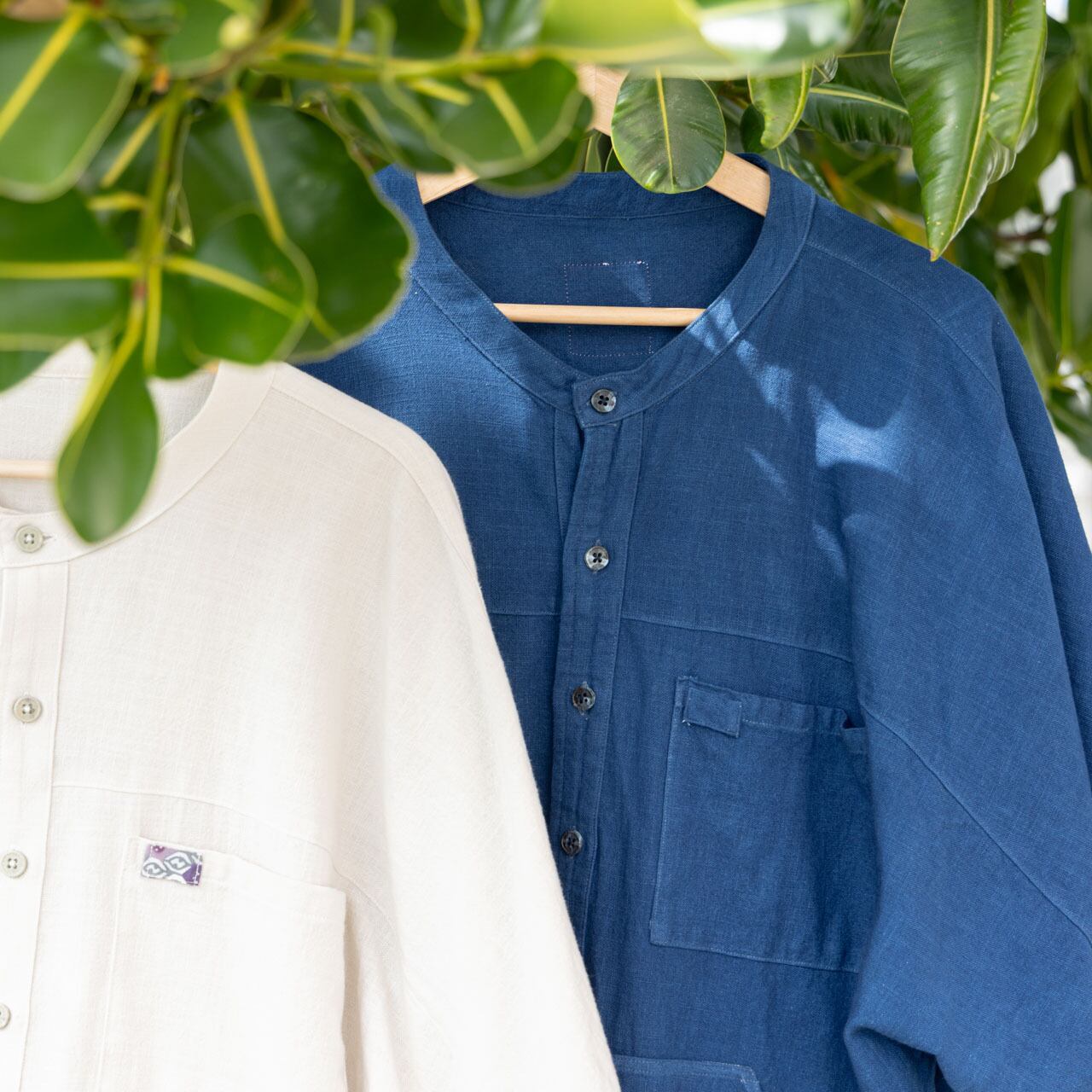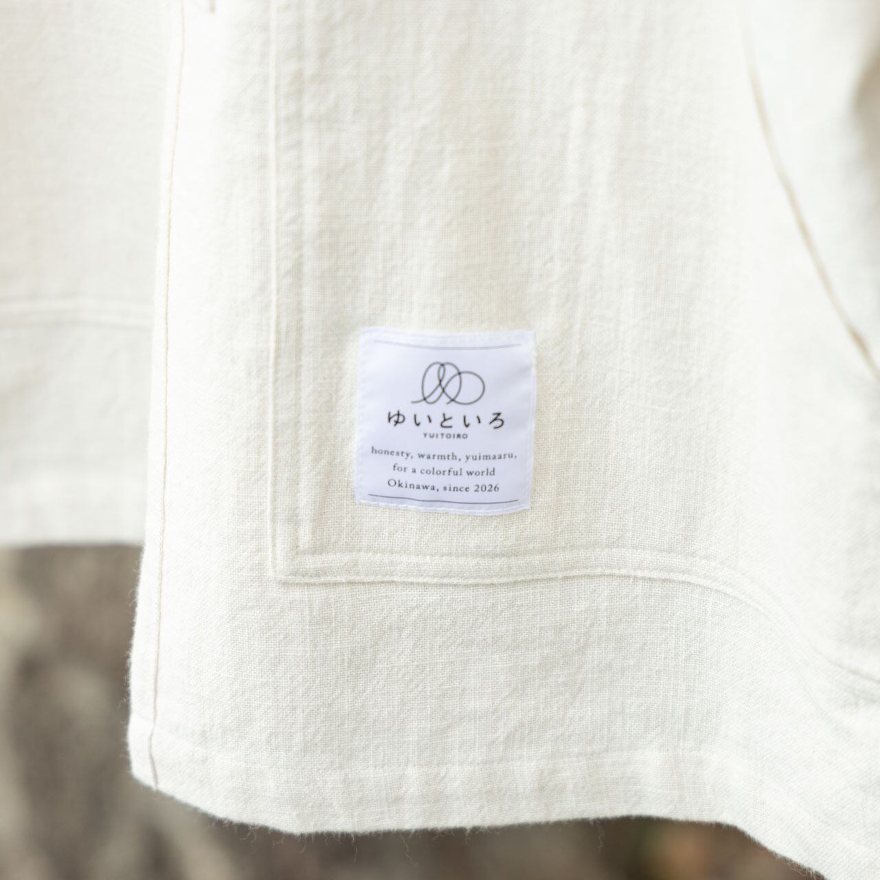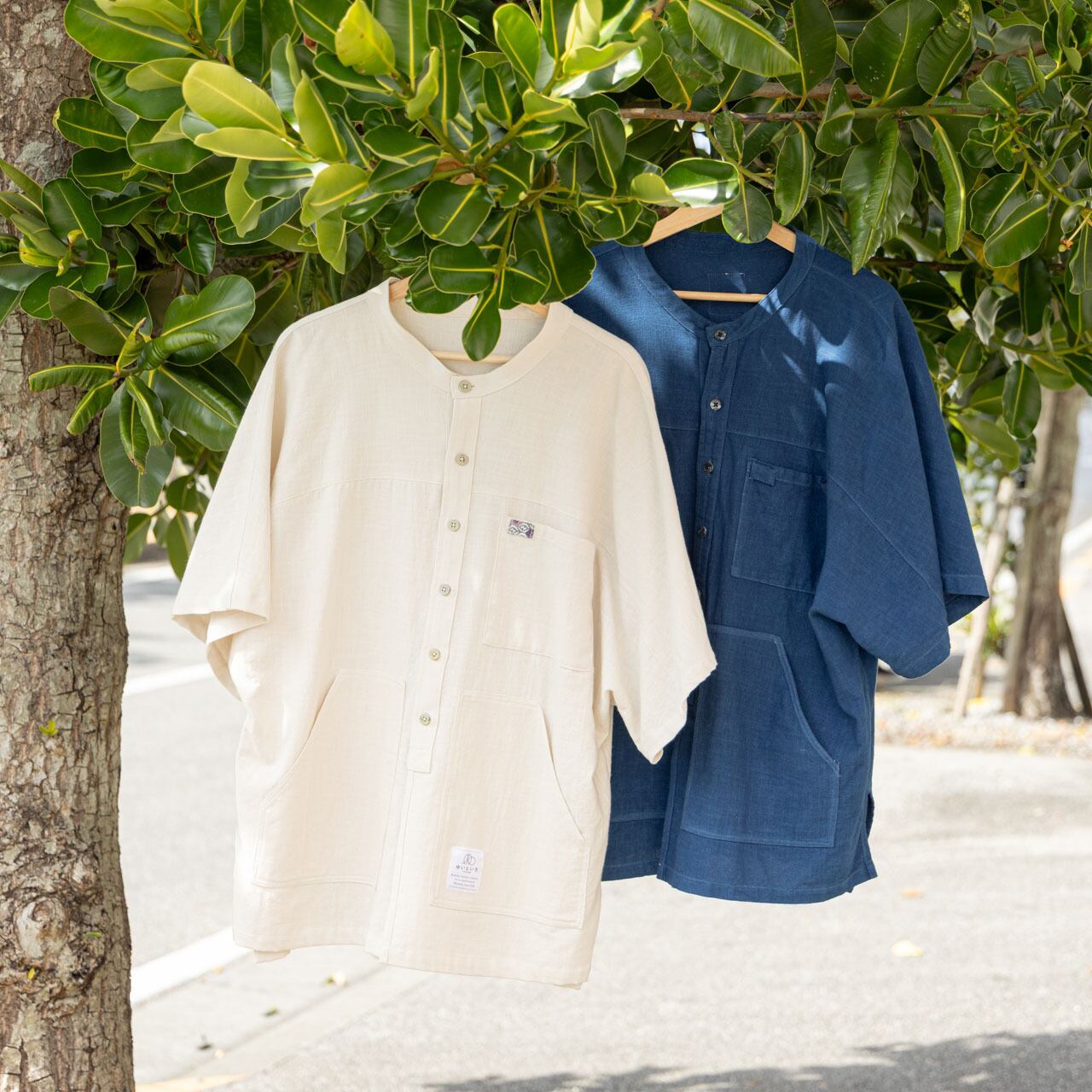 締めつけの少ない首回りやワークウェアのような動きやすさ、琉装のような直線的なライン、紅型の端切れを使った胸ポケットのフープなど、整えるだけでなく細部にアンバランスさを残し、十人十色の個性・遊び心として取り入れています。